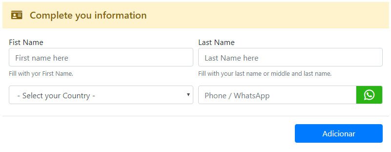 Ao efetuar o primeiro login, em sua conta, você informará os seus seguintes dados: First Name (Primeiro nome), Last name (Último Nome), your Country (Seu país) e Phone / WhatsApp (Telefone / WhatsApp, se desejar). Conforme imagem abaixo: